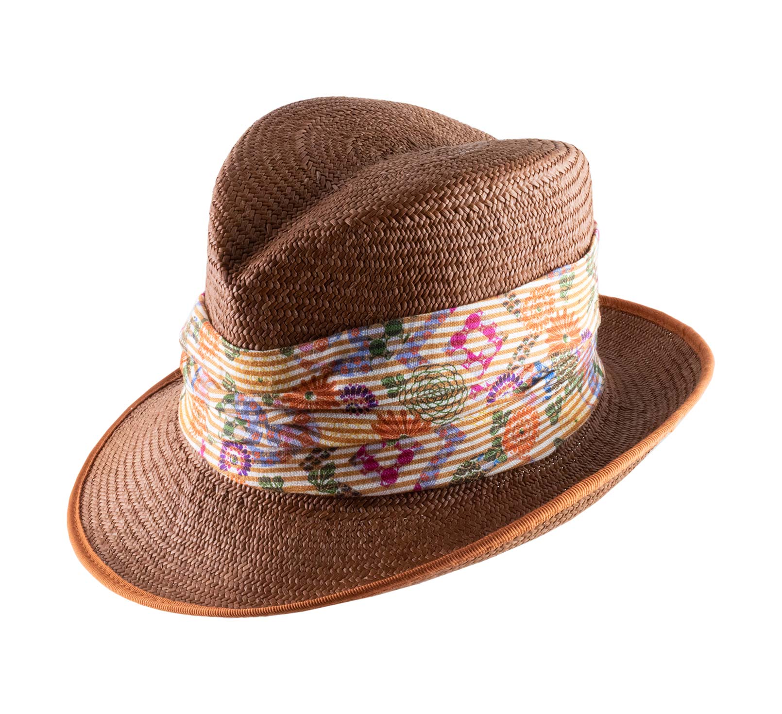 Genuine panama hat from Cuenca, Ecuador. Its natural matter is adorned with a colored flowered linen fabric. Its center dent crown is rather high, whereas its asymmetrical brim brings an original touch. It'll be covering our outfit with style by adding an originally casual touch.