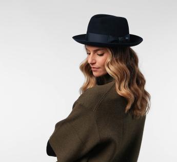 Handcrafted in Italy, this felt hat embodies the pinnacle of refined elegance. Its brushed felt reveals a velvety finish that catches the light and highlights its delicate features. Adorned with a wide grosgrain ribbon tied in a classic knot, the hat is accented with a Guerra 1855 signature plaque, a testament to unparalleled artisanal craftsmanship.