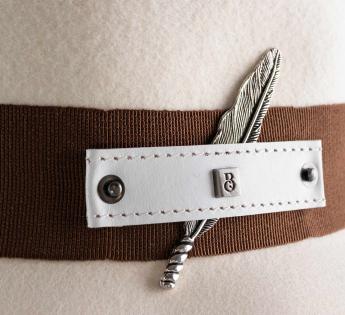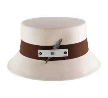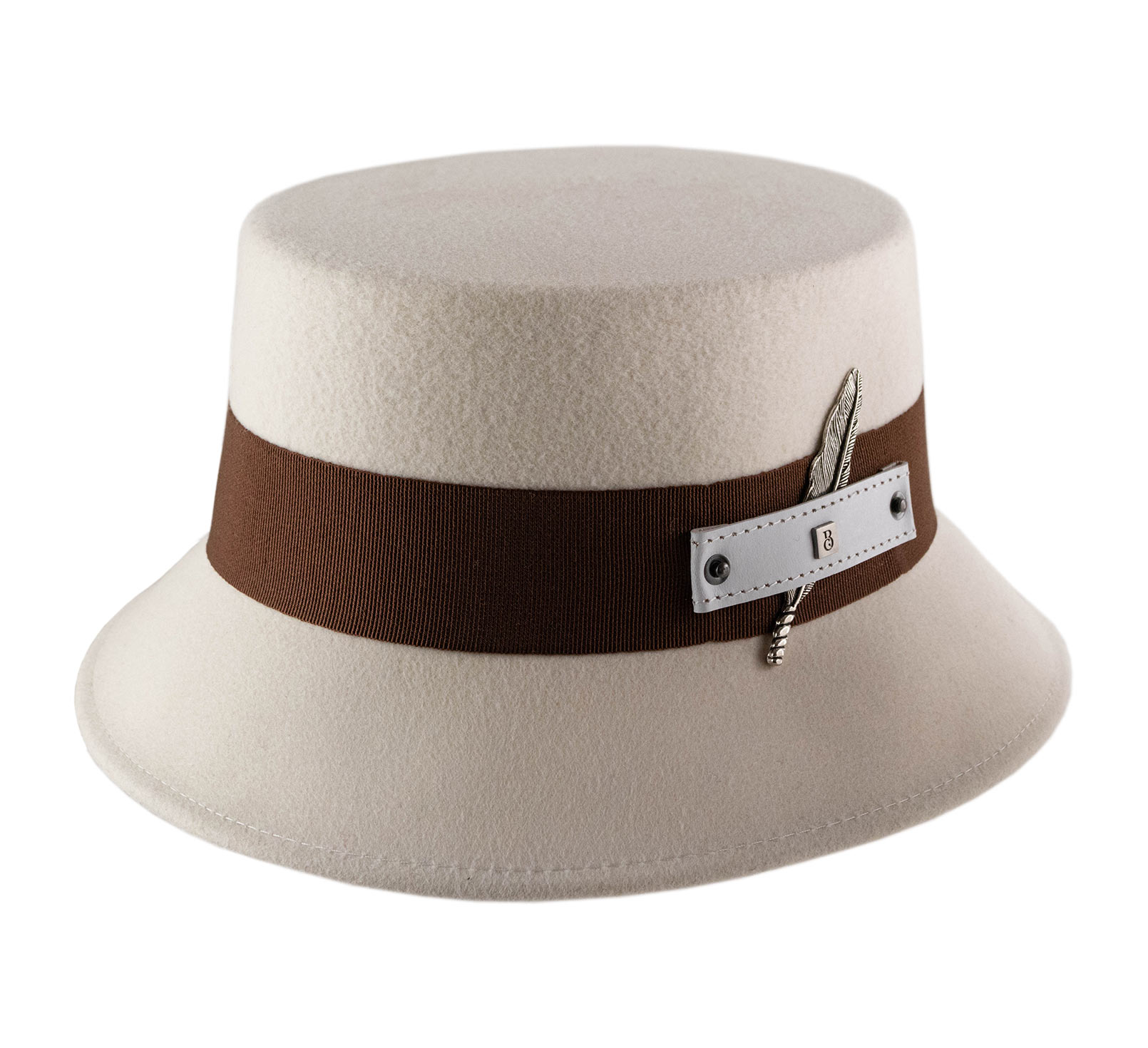 Bold and structured, this wool felt Bucket hat captivates with its contemporary flair. It is adorned with a wide grosgrain braid embellished with a metallic feather-shaped trimming, attached to a stitched leather tab.