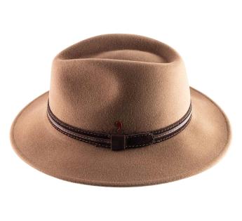 This wool felt outback hat by Alfonso D'Este combines style and functionality with elegance. Its soft yet durable felted wool provides ideal durability and protection for outdoor adventures. Its warm tone is enhanced by a contrasting leather band with delicate stitching.