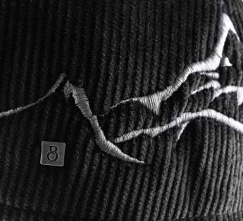 At the back, a stylized mountain landscape signs the piece with a strong gesture. This motif is embroidered in our Lyon workshop, with precision and attention to detail. The trapper inspiration takes a contemporary turn here, driven by the contrast between the graphic ornament and the velvety velvet. A cap designed for those who love understated pieces with real personality.
