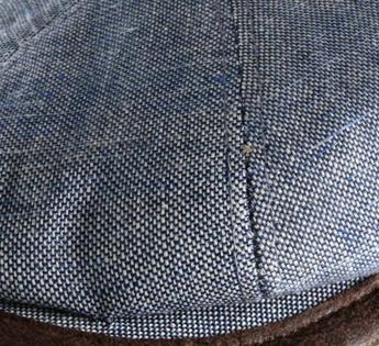 In materials indispensable for the summer, this cap plays on the contrast between the blue color of its cloth and the beautiful faux leather of its visor and garnished button. The design reveals a Hatteras cap by its puff-out shape and an Irish one through its eight panels.