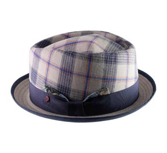 Pork pie hat in its chic and elegant aspect. The touch of elegance is strengthened by the satin braid with a bow tie, which was made in a patterned fabric. As for the crown, it features square patterns to set an urban and contemporary style.