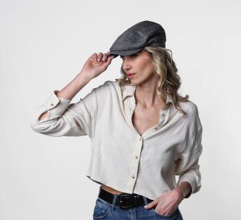 This cap displays a vintage cut here through a lightweight and silky fabric. The latter offers the design a nice brilliance through herringbone patterns traced with thin touches of color. The whole shows a watermarked superposition in modern and timeless tones.