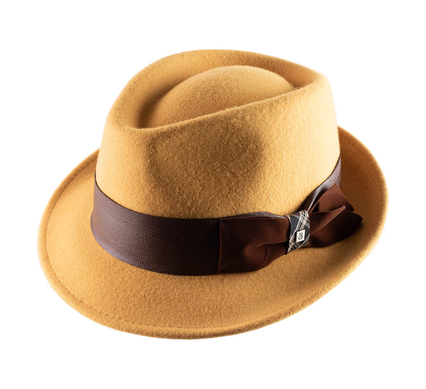 Trilby hat made from a mix of materials: faux leather, suede, and checkered fabric. Its felt is enhanced by a band that plays with textures. The model was crafted in our workshop.