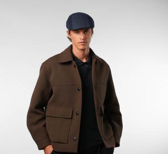 Duckbill with a fitted cut and a bold style. The panel play in virgin Shetland wool creates a subtle contrast between herringbone pattern and solid parts, for a look that is both elegant and contemporary.