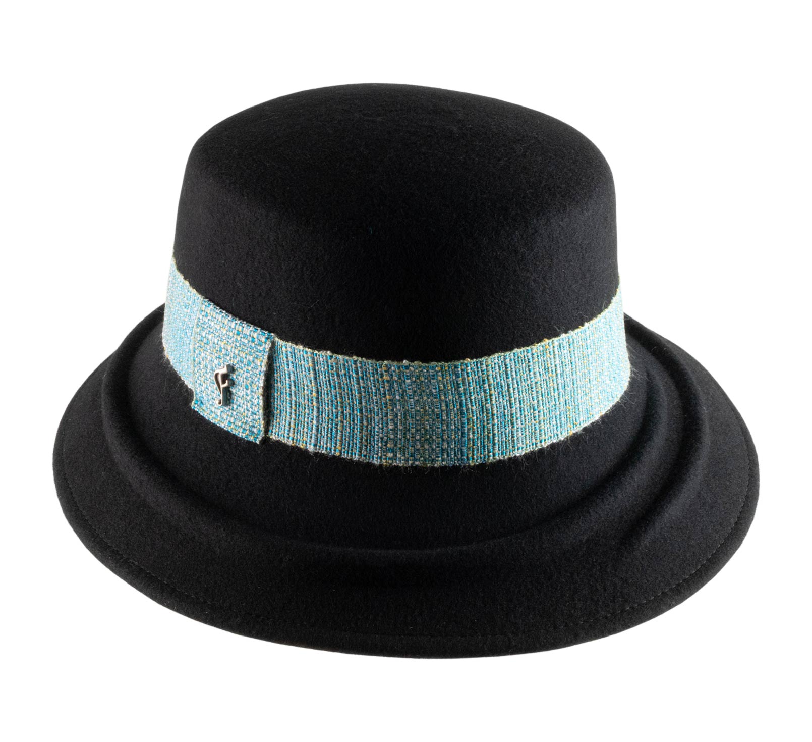 Cloche hat with a flattened crown. Its brim is sculpted with elegance and originality and its structure allows us to play with it, for instance by raising it. Consequently, following your mood, and your desires, you can adapt it to your look. This is a felt hat and it'll be bringing an unmatched comfort for every outing.