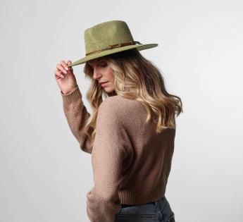 Traveller hat with a hardened brim and molded in a brushed felt to give a rustic effect to the model. Hence, an elegant and trendy design, always equalling our occasions. Its teardrop-shape crown is decorated by a discreet plaited braid in order to enhance a perfectly successful design on a functional and on a visual aspect as well.