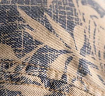 With its blue botanical pattern on a beige background, this duckbill cap exudes an exotic flair, enhanced by a fresh and refined graphic touch.