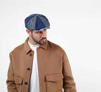 Patchwork cap in a wide cut, made through an alternation of different patterned blue fabrics. The button that unites the panels is designed matching the curve visor. As a consequence, the headgear features a modern effect mixed to retro influences for an always contemporary style, perfectly adapted and unanimously appreciated.
