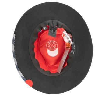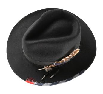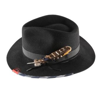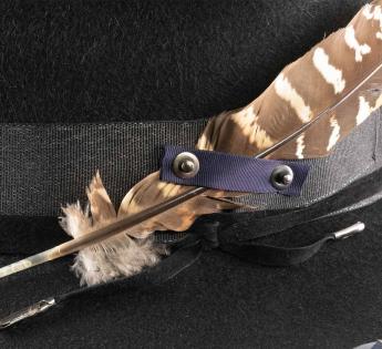 This hat is inspired both from the Fedora and the Traveller. It is an excuse to stage a mix of matters with felt, metal, grosgrain satin, which is enlivened by a feather. Its standard crown is combined to a rather wide brim to protect from the cold and make shade for our eyes. It will be offering comfort and warmth thanks to dense fibers.