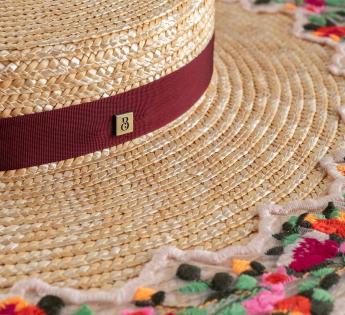 Let yourself be captivated by the airy elegance of this wide-brimmed hat, where every detail reflects exceptional craftsmanship. Carefully handcrafted in our Lyon workshop, it delicately combines the lightness of natural straw with the finesse of exquisite floral embroidery adorning the brim. Its satin ribbon, embellished with a golden signature, adds a touch of timeless refinement.