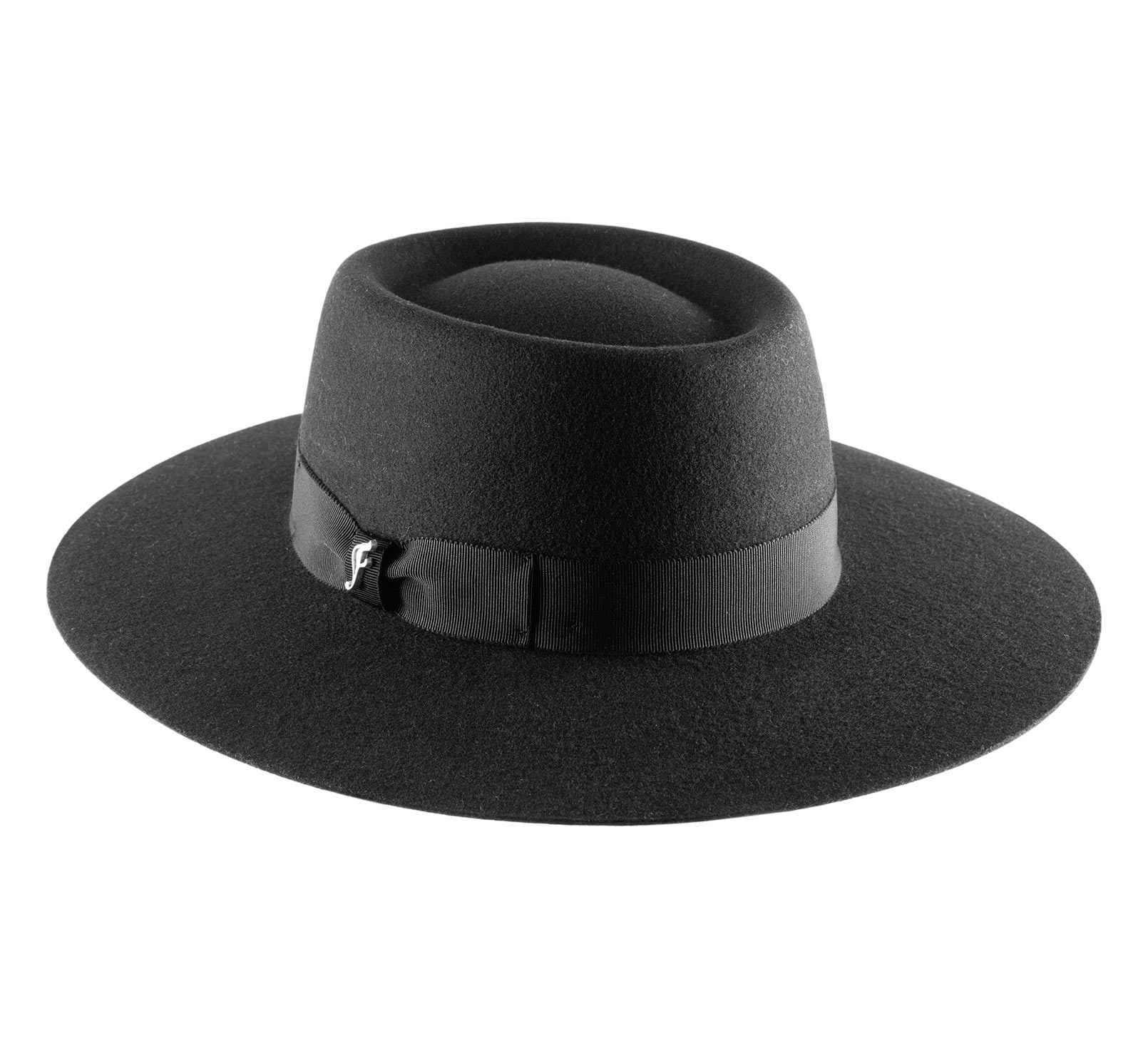 Elegant cordobes hat with a varnished and slightly hardened brim. It has been molded in felt wool to therefore ensure a naturally water-repellent covering with much warmth. The model is here adorned by a simple tone-on-tone braid, yet sophisticated as for the style.