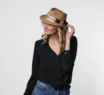 Trilby shape adorned by a grosgrain with herringbone patterns. The garniture is adding an ultra graphic note thanks to the three colors used. It is finished by a satin knot and with leather details to bring texture.