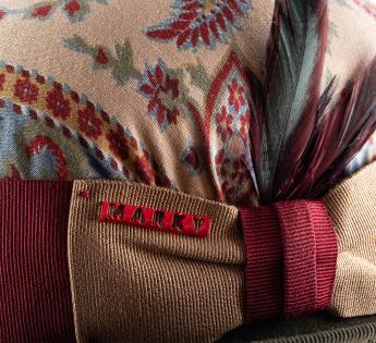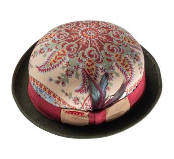 A standout piece in a limited edition, this Bowler Hat covered in vintage paisley fabric is distinguished by its unique allure. Each piece features a different pattern placement, making each hat truly singular. A carefully crafted trimming, enhanced with a two-tone braid and a rooster feather with green and burgundy hues, signs an audacious and refined silhouette.