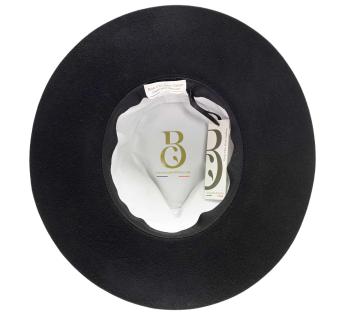 The matching grosgrain trim is enhanced with a delicate chain adorned with tiny pearls, creating a discreet jewel-like detail that elegantly illuminates the hat. The metallic emblem adds a signature touch to this exceptional model, while the matching satin lining ensures impeccable comfort. This fedora is the centerpiece of a refined and bold style.