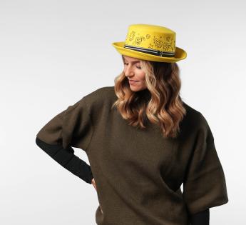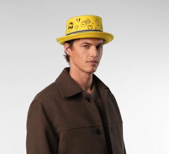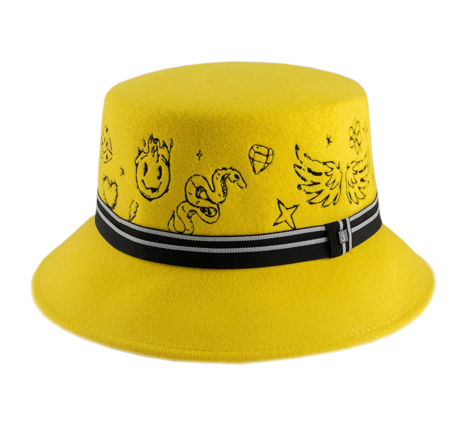 Colorful, bold, and ultra-creative, this wool felt Bucket hat reinvents the codes of headwear. Its flat crown is entirely embroidered with graphic tattoo-like patterns, adding a street and quirky touch. The striped braid structures the ensemble, enhanced by a metallic Label at the center. This model attracts all eyes while asserting true freedom of style.