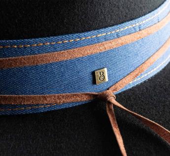 Rock'n'roll hat personalized with a stitched denim belt as a band. A double suede strap, tied in a bow on the side, completes the look with refined elegance.