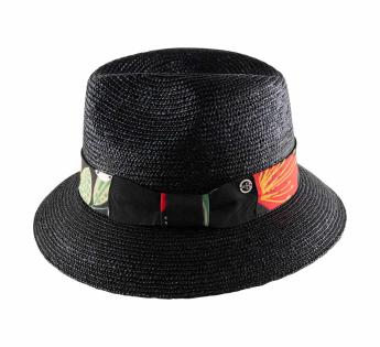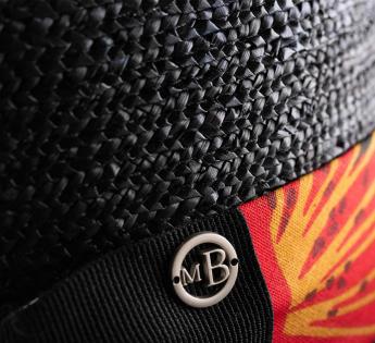 A hat of many facets, dancing with the summer light. Its ribbon, adorned with botanical patterns, plays with abstract, contrasting, and vibrant designs.
