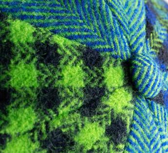 Fluorescent-colored Hatteras cap. Its panels feature herringbone and bold plaid patterns. The model is made from virgin wool, ideal for the season.