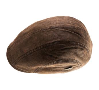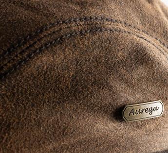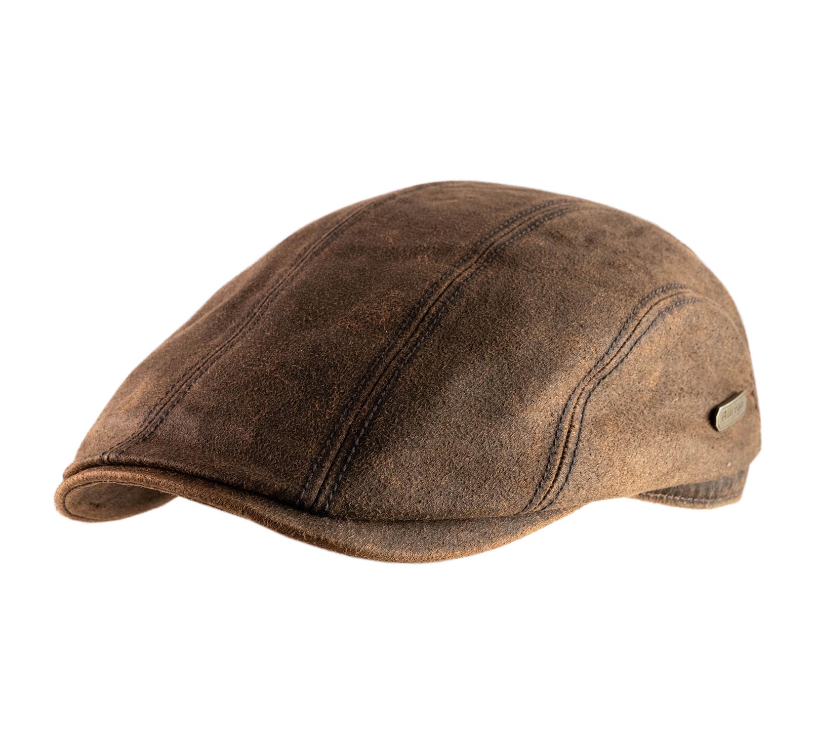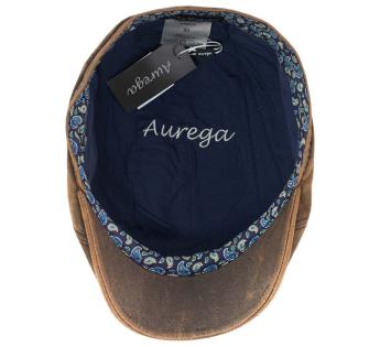 Waxed cotton flat cap. It gives the illusion of aged, patinated leather. Made from a technical fabric that combines the breathability of cotton with the durability of synthetic fibers, its warm color and soft texture give it a timeless character, perfect for those seeking an authentic yet refined style. The discreet metal emblem on the side emphasizes the quality and attention to detail.