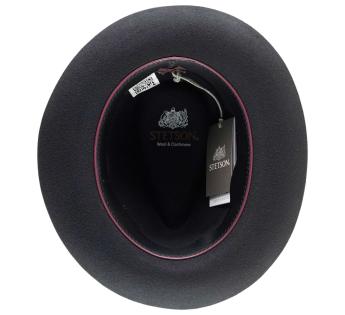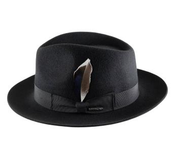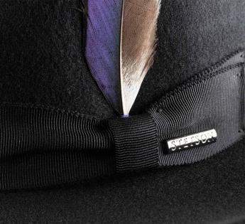 The mid-length brim, fully turned up, gives this Fedora Hat a soft and very modern line. Its sleek design gains character thanks to a natural feather subtly tucked into the grosgrain braid.