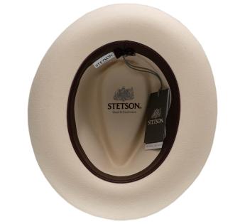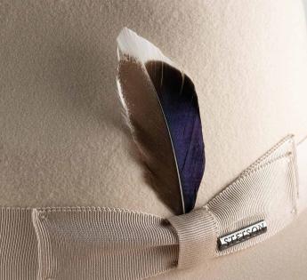 The mid-length brim, fully turned up, gives this Fedora Hat a soft and very modern line. Its sleek design gains character thanks to a natural feather subtly tucked into the grosgrain braid.