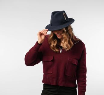 The mid-length brim, fully turned up, gives this Fedora Hat a soft and very modern line. Its sleek design gains character thanks to a natural feather subtly tucked into the grosgrain braid.