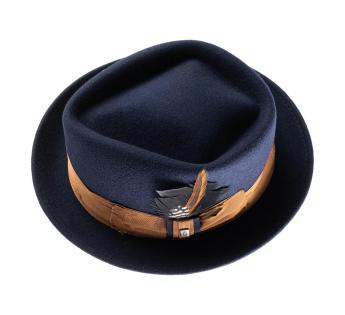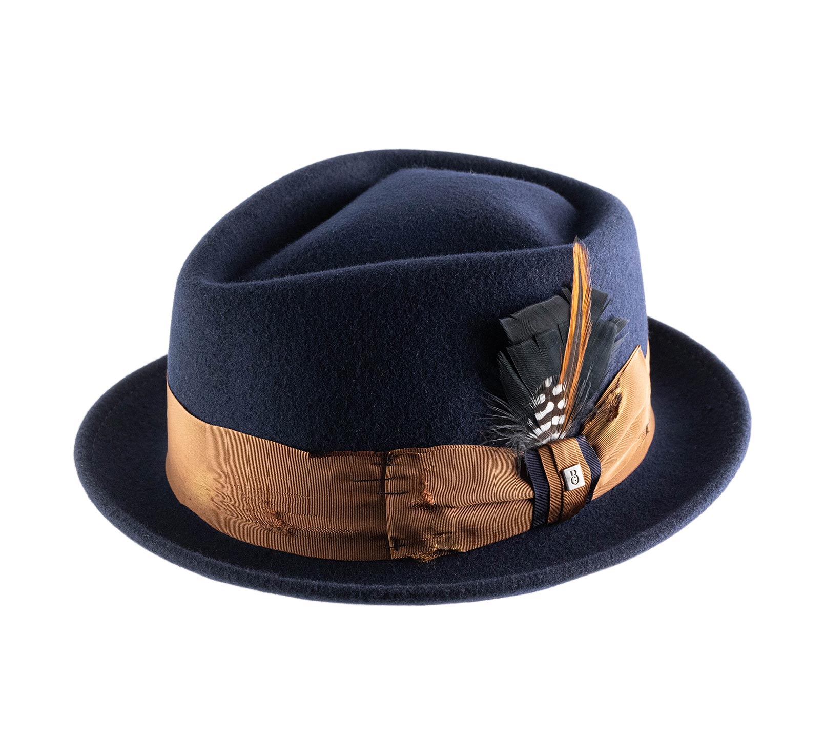 This porkpie reinterprets the codes of the classic with a touch of boldness. Crafted from a beautifully dense wool felt, it reveals a deliberately patinated look, almost cinematic.