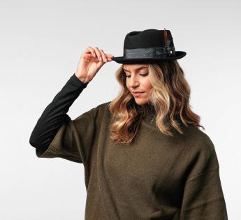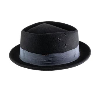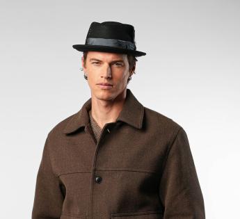 This porkpie reinterprets the codes of the classic with a touch of boldness. Crafted from a beautifully dense wool felt, it reveals a deliberately patinated look, almost cinematic.