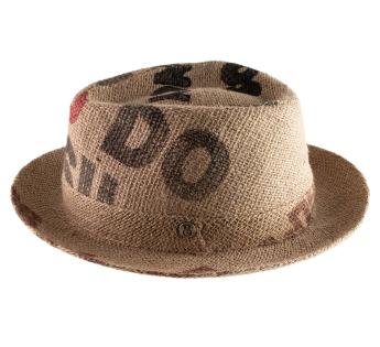 Classical Player hat through its shape, but original as for its material: the high crown and the shortened brim are cut from recycled coffee bags. Its forms are modern, more than the trilby, for example. It is fundamentally casual and its dress is creating a cozy environnement.