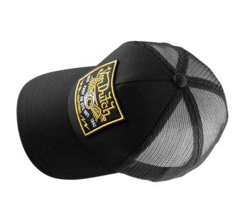 Its embroidered patch, the striking black and gold contrast, and the trucker silhouette evoke a raw, assertive American spirit—almost rock in its essence.